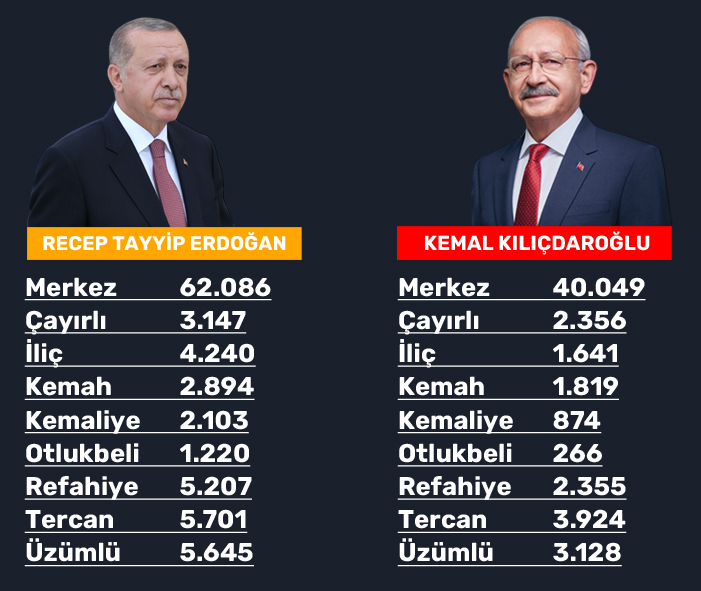 Cumhur İttifakı'nın adayı Recep Tayyip Erdoğan’ın, 92 bin 243 oy aldığı Erzincan’da, Millet İttifakı'nın adayı Kemal Kılıçdaroğlu ise 56 bin 412 oy aldı.