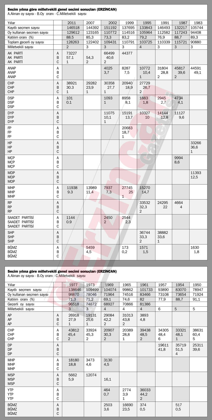 1920 ile 2011 yılları arasında TBMM’de 95 Erzincan milletvekili görev yaptı. Çok partili dönemde Erzincan Meclis’e 58 vekil gönderdi. Bu seçimlerde vekillerin 30’u sol, 28’si ise sağ partilerden oldu.