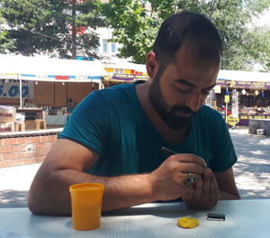 Genç usta, oyun hamurunun üzerine koyduğu pirinç tanelerine tek nefeste yazdığı yazılarla dikkat çekiyor. Pirinç üzerine yazılan isimler bir süre kuruduktan sonra özel getirilen cam şişesinin içine bırakılarak, kurutulmuş gül, papatya ile gliserin doldurulduktan Su Damlası, Kalp gibi objelerin içine yerleştirerek rengarenk hediyelik kolyelere dönüştürüyor.