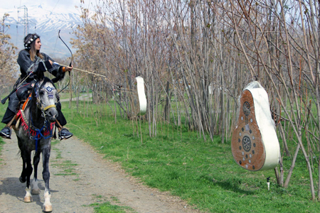 Geleneksel Türk Okçuluğunu öğrenen kız öğrenciler eğitimlerini açık havada ve at sırtında yapıyorlar.